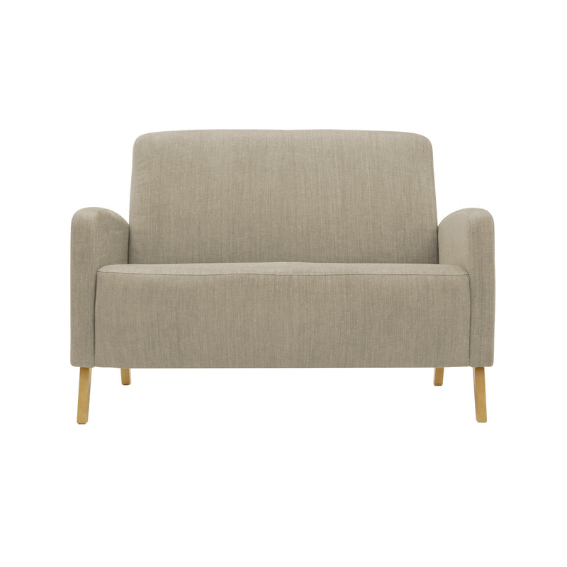 Fanni 2-istuttava sohva hiekan värisellä Naomi 430 -verhoilukankaalla ja luonnonvärisillä tammijaloilla.
