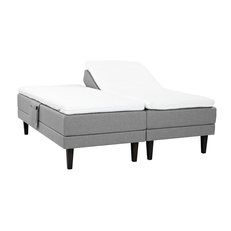 Harmaat Hilding Feel -moottorisängyt hiilenmustilla 23 cm korkeilla Royal -tammijaloilla ja erillisillä Hilding Hybrix Air Coolmax -sijauspatjoilla. Kuvan tarviketasku myydään erikseen.