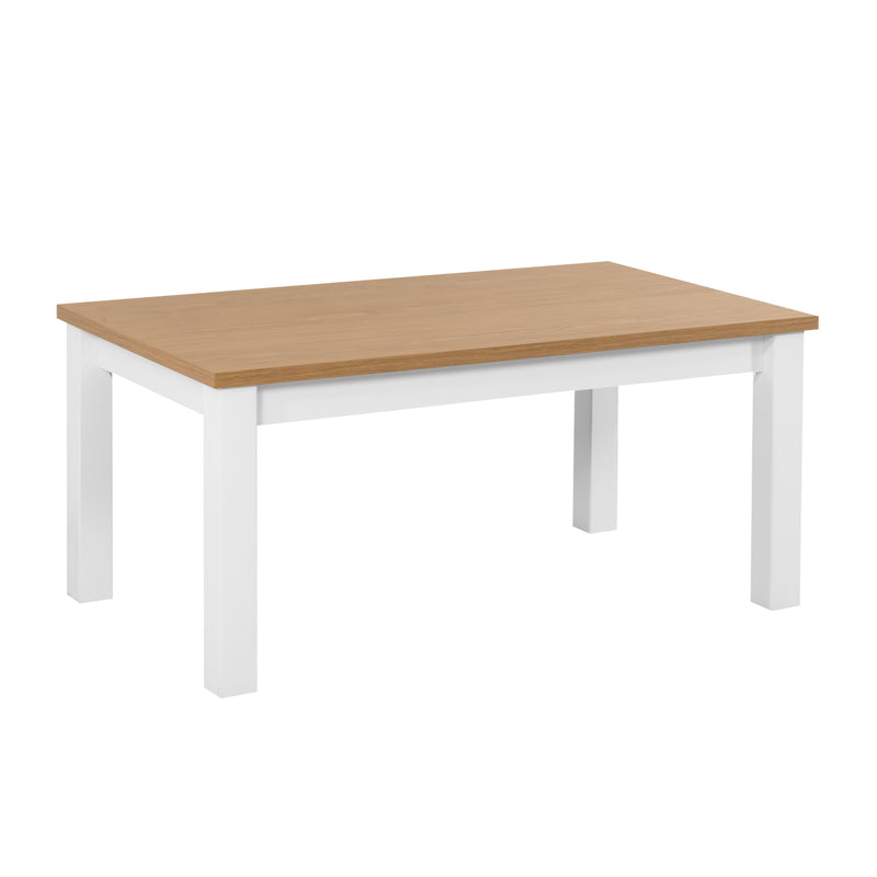 Valkoinen Kivi-sohvapöytä tammen värisellä kansilevyllä.