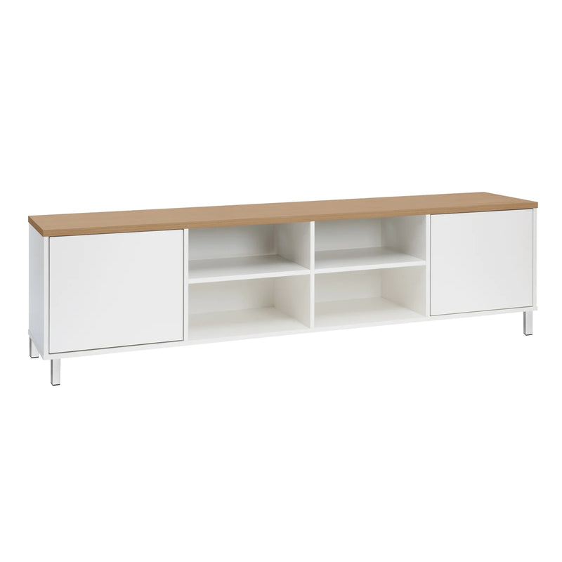 Kivi-sarjan leveä tv-taso toimii myös näppäränä matalana tasona, joka tuo reilusti säilytys- ja laskutilaa eri tiloihin. Kivi-tv-tason avulla television ja oheislaitteet saa sijoiteltua parhaalla mahdollisella tavalla. Viihdekeskuksessa on tasotilan lisäksi keskiosan avohyllyt ja niiden molemmin puolin tilaa medialaitteille kahden ovikaapin verran. Ovikaapeissa on johtoaukot kaapeleille ja kaappitiloja saa säädeltyä sopiviksi siirrettävillä välihyllyillä.