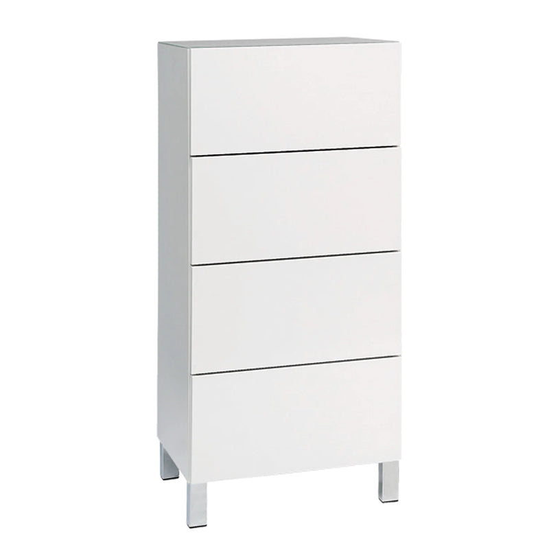 Ylellinen lasikantinen neljän laatikon kapea lipasto kotimaista Lumo-sarjaa. Lumo-kalusteissa viehättää tyylikäs hohtavan valkoinen korkeakiiltoinen väri sekä käyttömukavuus, joka tulee push to open -mekanismin myötä. Kalusteet valmistetaan pitkän kokemuksen tuomalla varmuudella Kauhajoella ja toimitetaan valmiiksi koottuina.