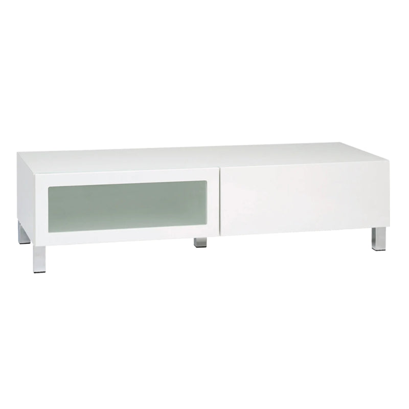 Lumo-sarjan ihastuttavassa kapeassa tv-tasossa on oikeanlaiset säilytystilat medialaitteille, läpiviennit johdoille sekä tietenkin sopivasti tilaa tv:lle ja mahdollisille oheislaitteille. Vasemmanpuoleisessa laitetilassa on klaffiovi etsatulla lasilla ja toisella puolella on laatikko. Voit valita tv-tason joko 5,5 cm korkealla jalkasokkelilla tai 10 cm korkeilla jaloilla. Malliston eri osista yhdistelemällä saa koottua yksilöllisiä ja toimivia kokonaisuuksia.