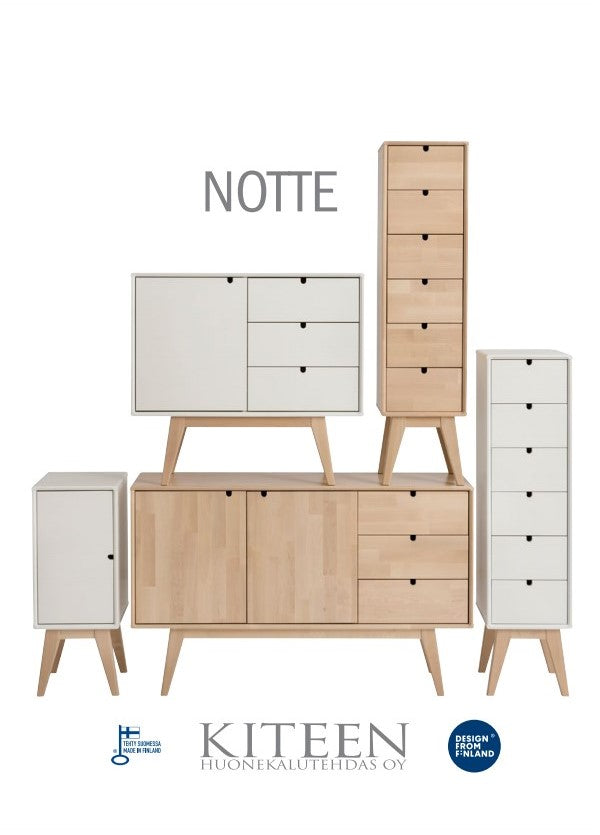 Hauska Notte-sarjan lipasto on täynnä pieniä yksityiskohtia. Lipaston jalkasarja on koivunvärinen ja sen lipasto-osan värivaihtoehdot ovat luonnonvärinen lakattu koivu ja maalattu valkoinen. Tyylikään elegantti, korkea Notte-lipasto soveltuu erinomaisesti useisiin eri tiloihin kotonasi. Kapea, mutta korkea muotoilu tekee lipastosta kevyen näköisen ja mahdollistaa sijoittelun pieneenkin tilaan tuoden suuren määrän säilytystilaa.