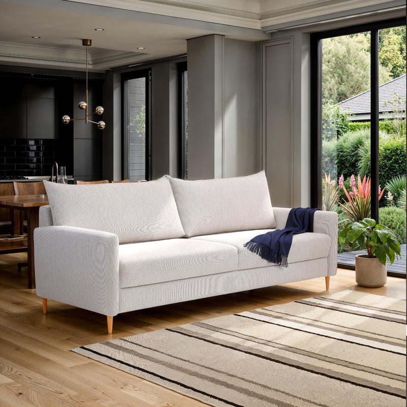 3-istuttava Stockholm-vuodesohva beigellä Diamonds 289 -kankaalla. Sohvassa on 12 cm korkeat luonnonväriset tammijalat.