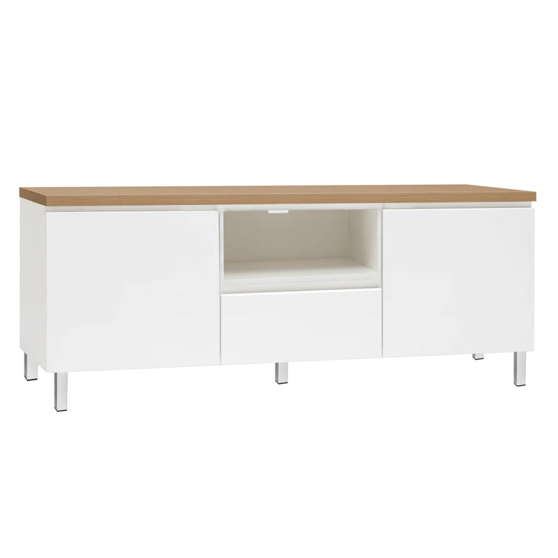 Kuvassa on 137 cm leveä valkoinen Viiva-sarjan tv-taso tammenvärisellä kannella ja hopeanvärisillä alumiinijaloilla.