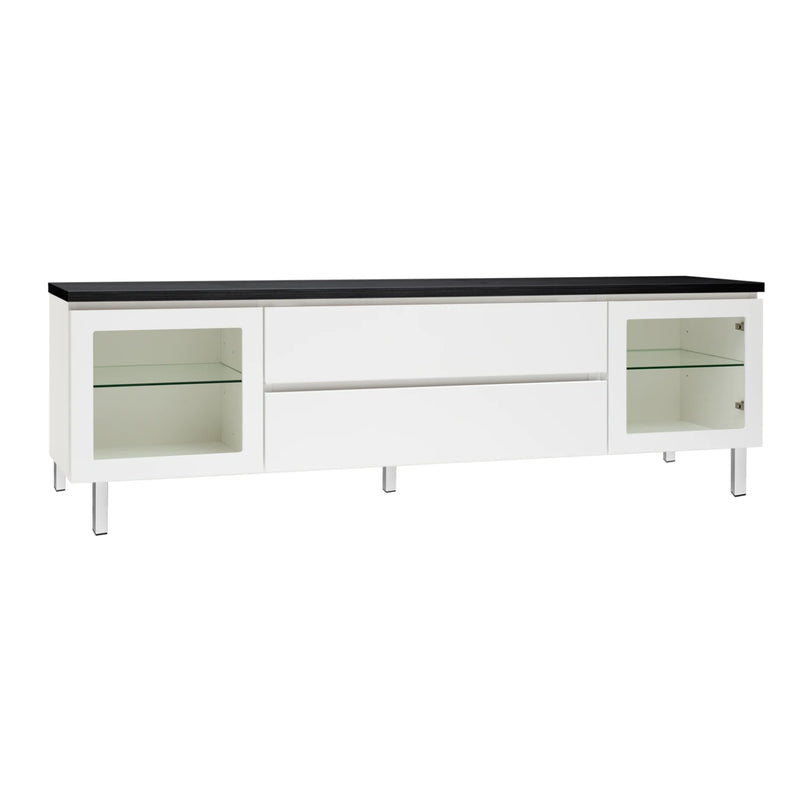Kuvassa on 184 cm leveä valkoinen Viiva-sarjan tv-taso mustalla kannella ja valkoisilla metallijaloilla.