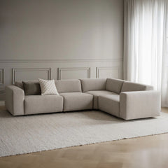 Kuvassa on Willard-kulmasohva vaaleanbeigellä Alice 01 -kankaalla ja mustilla muovijaloilla.